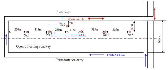 Six surface wells weredesigned in the 1422(1) panel, namely, surface well No. 1, No. 2, No. 3, No. 4, No. 5 and No. 6. Among them, the first five surface wells are 80 m away from the track entry, 160 m from the transport entry and 260 m, 575 m, 890 m, 1205 m and 1520 m from the open-off cut. Surface well No. 6 is a 50 m surface well, 190 m from the transport entry and 775 m from the open-off cut. The distribution of surface wells is presented in Figure 14. These six surface wells were drilled in two periods. Wells 1–3 were drilled in the first period, while Nos. 4–6 were drilled in the second period. All six wells were constructed using the principle of “resistance and dodge” and the surface well completion and protection method of “upper stop and lower leak”. The basic parameters of CBM drainage surface wells in the 1422(1) panel are listed in Table 1.