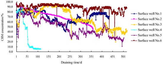 Variations of concentrations of drained CBM by surface wells in the 1422(1) panel over time.