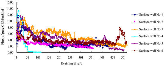 Flux of drained CBM by surface wells in the 1422(1) panel over time.