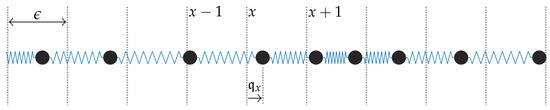 where is the kinetic energy, and W, V are potentials, wherein V depends only on relative positions of adjacent atoms [19,20]. The atom transmits energy to its neighbors through elastic bonds—see Figure 1.