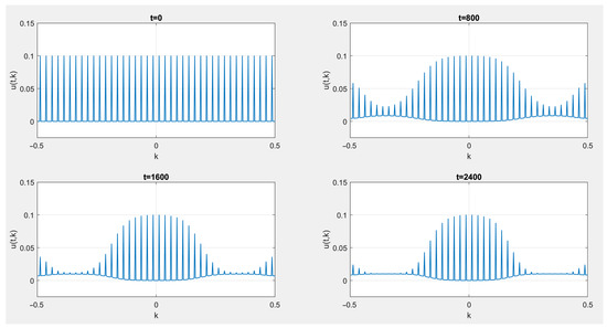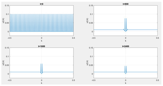 Initially, the energy is set concentrated on modes −0.03, −0.01, 0.01, 0.03, 0.05… After 2400 time steps, we observe that energy is uniformly distributed over all modes outside a small vicinity of 0; however, the spikes closest to are still visible. This corresponds to the fact that long-wave energy is not susceptible to dissipation, which results in superdiffusive heat flow. Now, let us consider the scattering rates obtained from linear dynamics with Ornstein–Uhlenbeck perturbation, i.e., determined by the kernel (12). We made both models comparable by normalizing both kernels, i.e., by dividing each by . If the scattering rates are given by (12) with and being a positive constant functions (and therefore separated from zero), the plots of energy distribution are as seen on Figure 6.