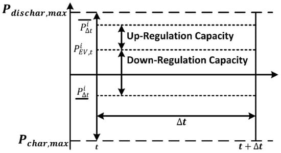 Analogously, the charge or discharge rate of EVs can be curtailed for a specific time interval Δt when surpasses as shown in Figure 2. By implementing this measure, the NRC of each EV for the time interval Δt can be effectively ascertained. The NRC capacity of an EV during Δt is determined through a comprehensive assessment of its charging or discharging power in comparison to the maximum available discharging power.
