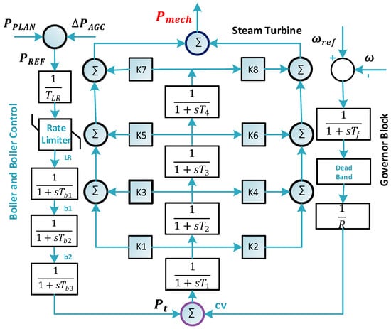 This research extensively analyses the aggregated TES model concerning active power balancing control. A particular emphasis is placed on the boiler response time, a crucial parameter affecting the overall plant’s reaction and system stability. The TES model, depicted in Figure 3, is derived from previously described models [,]. The TES model underwent simplification to facilitate long-term dynamic simulations. Two essential inputs, main steam pressure ) from the boiler and control block, and the control valve (cv) from the governor block, determine the mechanical output power ( of the steam turbine block. When load fluctuations () arise, the boiler model quickly computes the suitable ) value to offset the load changes, considering the turbine’s output limitations and steam energy storage delays.