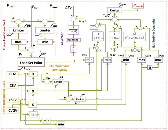 A detailed GTES model was developed (Figure 4). The GTES is the primary response source, achieved through the governor linked to the generator’s turbine. The GTES governor incorporates a dead band and a low-pass filter, showcasing droop characteristics. The dead band ensures stability by disregarding low-frequency deviations, while the low-pass filter stabilizes rotor speed against high-frequency deviations, further promoting system stability. Any power deviation beyond the dead band’s limits leads to frequency deviations, which activates the droop characteristic signal, ultimately generating a power demand signal . This signal drives the necessary adjustments in the power generation process, allowing the GTES to promptly and effectively respond to power fluctuations within the system. The signal holds utmost significance in the functioning of the GTES, which includes the power limitation block (PLB), power distribution block (PDB), and gas turbine dynamics block (GTDB) (Figure 4). The PLB imposes physical constraints on the turbine’s response, enforcing upper and lower power level restrictions ( and ) based on combustion technology limitations. To comply with combustion constraints, the set points and act as maximum and minimum load limits. Additionally, a rate limiter block carefully regulates the rate of change for the signal to optimize gas turbine performance while ramping up and down processes. The PLB produces a CLC signal that acts as an input to the PDB. Two sequential combustion chambers are included in the PDB block that skillfully blend compressed air with fuel to initiate efficient combustion processes. Initially, the environment incineration chamber receives compressed air, subjecting it to warming, and deftly blends it with 50% of the overall fuel. Subsequently, the mixture is forcibly expelled through a high-pressure turbine, provoking its rapid rotation. The resultant mixture is directed into the SEV chamber. Here, an additional 50% of the distributed gasoline is intricately amalgamated with a measured quantity of supplementary air, guaranteeing an optimal combustion process.