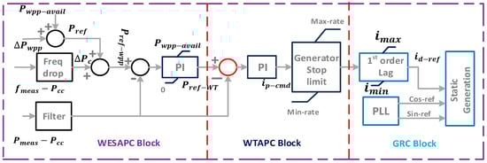 Figure 5 provides a comprehensive investigation into the dynamic behavior of WES and its capacity to contribute to grid balancing through active power control. WES emphasizes the overall performance of aggregated wind energy systems (WESs) within the power system. The WES model is expertly streamlined and tailored for active power regulation and long-term dynamic simulation studies []. WES comprises essential blocks, such as wind turbine active power controller (WTAPC), WES active power controller (WESAPC), and generator reference current block. The frequency droop block is crucial in providing primary frequency response ( contingent on available wind power and systemic frequency droop parameters. This intricate relationship ensures the power plant responds actively and effectively, maintaining grid stability and balance through active power control. The efficacy of this reaction is contingent upon the magnitude of wind power accessible ( and the intricacies of the power system’s frequency droop parameters, amplifying the plant’s dynamic interplay with the power grid.