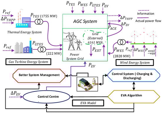 This paper is structured systematically, with Section 2 focusing on the detailed modeling of TES, GTES, WES, and the EVA model. In Section 3, the AGC system modeling is outlined, incorporating the model of the power plant units and EVA system. Section 4 delineates the proposed power dispatch approach and validates its performance. Section 5 concludes the paper, drawing insightful conclusions from the investigation and providing future recommendations.