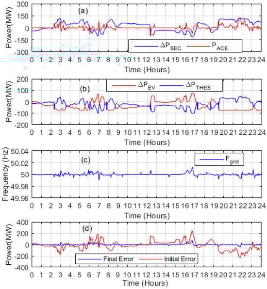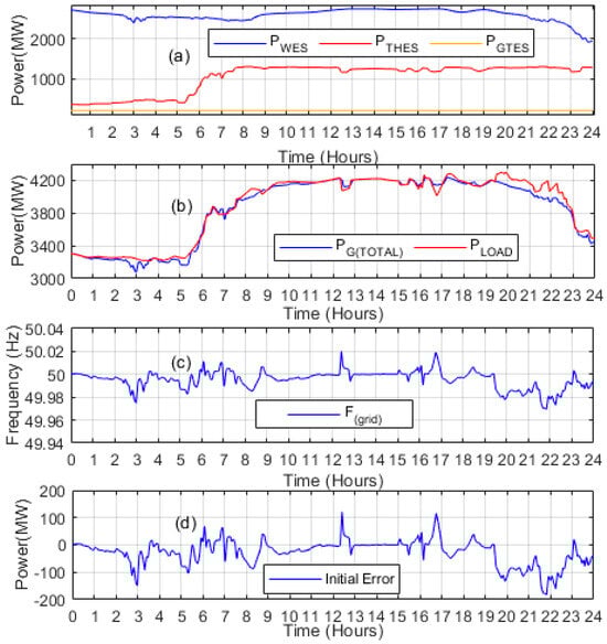 Figure 7a illustrates the actual power generation from various power plant units, comprising TES, GTES, and WES, over 24 h of the Pakistan power system. For data acquisition, a winter day in 2023, was carefully chosen as input data for the TES and WES. However, the GTES power remained constant, maintaining a fixed value throughout the entire period. An essential aspect to consider is that the real inputs of the WES differ from the reference values (forecasted values) initially used to calculate the load-generation balance. Hence, variations between the actual and forecasted values of WES and changing load demands cause a power disparity between power demand and supply, significantly impacting the overall power system performance.