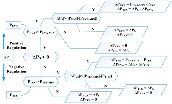 The time constant calculates the tracking speed of the regulator in activating the operating reserves from the power units, which contributes to the AGC regulation process. The resultant generated error of the AGC is divided into the power units and the EVA system as per the defined dispatch strategy in Figure 6. This study incorporates a diverse mix of resources in the AGC system, comprising TES, WES, and EVs, all contributing to the provision of regulation reserves. The dispatching section of the AGC, upon receiving inputs, such as , the EV aggregator data, and the , effectively calculates the necessary adjustments in the load reference of the power producing units, denoted as and , respectively.