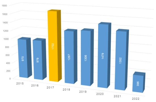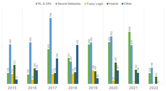 In light of these challenges, model-free control methodologies have emerged as promising alternatives. Model-free control strategies offer several advantages for the control of sophisticated frameworks such as building energy management systems (BEMSs), electric vehicle charging stations (EVCSs), traffic management systems (TMSs), IoT ecosystems, and even autonomous navigation of robotics [15,16,17,18,19,20,21,22,23]. To this end, model-independent control methodologies provide a fruitful control approach for sophisticated autonomous HVAC control. Firstly, such strategies are not strictly dependent on explicit models of the system, eliminating the need for the time-consuming and often inaccurate process of system modeling [24]. This is particularly advantageous in HVAC control, where system dynamics are highly nonlinear, complex, and influenced by numerous external factors, especially in large-scale building structures. Moreover, model-free control algorithms, such as the well-known reinforcement learning and artificial neural network approaches, are adequate for directly learning from data, adapting to changes, and effectively handling complex, nonlinear system dynamics. Such data may be historical or real-time data, fostering continual improvements in control policies over time. Such adaptability allows them to outperform traditional control strategies like RBC in situations where the system’s dynamics are changing or uncertain [25,26]. Additionally, model-free strategies are adequate for optimizing multiple objectives simultaneously, such as energy efficiency, comfort, and equipment lifespan, providing a more holistic approach to HVAC control. They can also handle the interactions between different components of the HVAC system, which may lead to improved overall system performance, e.g., multifunctional HVAC frameworks integrating numerous heterogeneous devices. These unique attributes mean that model-free control is a significant focus in the literature on HVAC control. Figure 1 illustrates the aggregated citations per year for model-free HVAC control research approaches for the period 2015–2022, as measured in Scopus, which highlights their importance and potential in the literature.