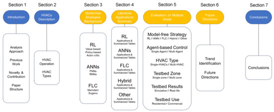 The sections of this paper are structured as follows. In Section 1, the introduction and motivation of the current work are illustrated, whereas in Section 2, a general description of HVAC operations and types is provided. In Section 3, the mathematical background and overview of primary model-free methodologies and their subdivisions in terms of HVAC applications are presented. Section 4 discusses the primary literature works, divided into the aforementioned model-free approaches. More than 70 highly cited papers from the 2015–2023 period, along with their conceptual backgrounds and results according to the different model-free approaches, are highlighted. Section 5 summarizes the features of the relevant papers regarding different thematic areas. Each column represents a different thematic area concerning the primary model-free approach and its agent type, optimization target, HVAC type, building zone type, building testbed type, and building use type, as well as a summary of the achievements and number of citations of each work. Section 6 utilizes information from Section 5 regarding the different thematic areas and presents separate evaluations of the related testbed attributes that characterize the aforementioned HVAC control works. Section 7 presents valuable conclusions from the evaluation of the highly cited HVAC literature works. Figure 2 portrays a visual representation of the paper structure per integrated Section/Chapter.