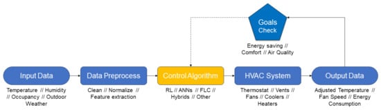 For many years, occupants and building users have relied on simple, manual methods to operate HVAC systems, including adjusting thermostats, opening windows, or switching fans on and off based on immediate comfort needs [5]. However, although these manual approaches provide a direct and tangible way to influence the indoor environment, they often lack optimal energy utilization and the preservation of consistent comfort over time. To this end, the need for a more sophisticated control approach has become clear, fostering the introduction of basic thermostats and timers. These elements allow for preset temperature settings and scheduled operations, offering a degree of autonomous control while maintaining consistent comfort levels [3]. However, such approaches lack adaptability to real-time environmental changes and occupant preferences. Their inflexible settings often lead to energy wastage during unoccupied periods or unexpected weather shifts, necessitating a more advanced control theme [4,6].