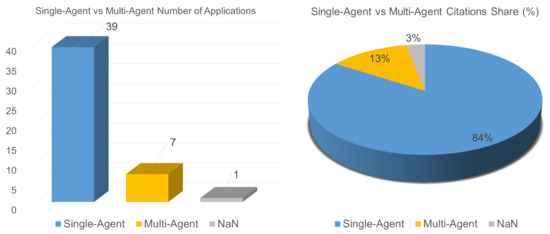 Both the state-value function and the action-value function have crucial roles in RL, often complementing each other yet also serving distinct purposes depending on the nature of the problem and type of action. For instance, the state-value function is employed in various policy-based methods, such as the classic value iteration, an established dynamic programming (DP) method; policy improvements; policy gradient methods; and approximation techniques [33,34,35]. Its main objective is to estimate the expected cumulative reward for different states and guide necessary policy improvements. On the other hand, the action-value function is used in value-based methods, such as Q-learning or SARSA, both of which are characterized as temporal difference (TD) learning methods. These algorithms are especially suitable for cases where actions are discrete and sequential [36,37]. It is noteworthy that SARSA also integrates Q-learning principles within its main structure. Methods combining both kinds of RL approaches are called actor–critic methods, most of which belong to the deep reinforcement learning category. Value-based, policy-based, and actor–critic approaches are described below.