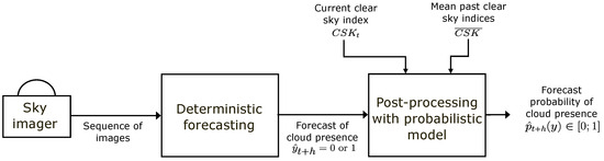 The probabilistic forecasts are generated in two steps as presented in Figure 1. First, we generated deterministic forecasts of cloud presence using the method proposed by [18] and briefly presented in Section 3. The results are discrete forecasts (1 = no cloud and 0 = presence of clouds) with a time resolution of 1 min and horizons of forecast up to 30 min. The second step is a post-processing of the deterministic forecasts with a probabilistic model. In this work, we compared three different models, described in Section 4, to post-process the deterministic forecasts. The final probabilistic forecasts have the same temporal resolution and the same horizons as the deterministic forecasts. After these two steps, the generated forecasts are probabilities, in the interval , that gives a level of confidence or risk associated with the future presence of clouds. Compared to deterministic forecasts, this additional information may help the user in decision-making.