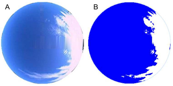 The processing of images consists in defining different value combinations from RGB and HSV color spaces. Cloud identification follows a sequence of combinations. The first one is the detection of pixels that represent the cloudless sky parts in the image. The process involves complex and numerous combinations and ratios between all image channels, which can be analyzed in [30]. When the algorithm finalizes, a sky representation is obtained, taking the position of clouds if they exist. Figure 3 represents a typical cloud detection in a sky cam image, where the A image represents the raw image, whereas B represents the processed image where the blue pixels represent the clear sky and white pixels the clouds.