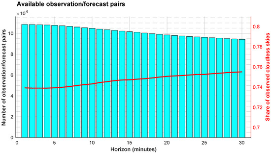 Number of observation/forecast pairs (blue bars) and ratio of observed cloudless skies (red line) in the test set (2011) for forecast horizons ranging from 1 to 30 min.