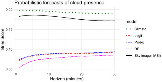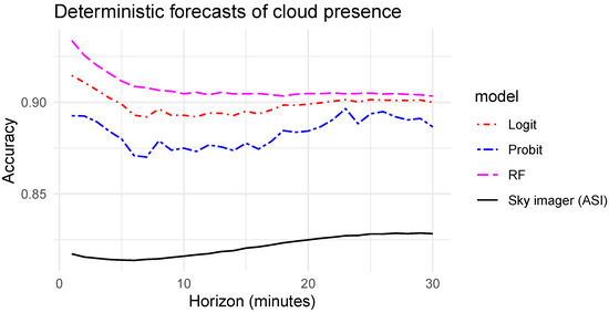 Figure 8 shows the evaluation of the quality of the deterministic forecasts before and after the post-processing with the three discrete choice models tested in this work. Surprisingly, with longer horizons, the accuracy of the initial forecasts done with the sky imager increases (solid black line). This observation results from the share of clear and cloudy skies available in the test sets presented previously in Section 5 and Figure 7. Indeed, for longer horizons, the share of clear skies, which are easier to forecast when there is no cloud in the field of view of the ASI, is more important. We could have homogenized the test sets of the different horizons to cancel this effect. However, removing conditions with fast-moving clouds from the shorter horizons would have biased the analysis of the improvement brought by the probabilistic approach which is more interesting when forecasting becomes more uncertain. Even if this effect does not influence significantly the results of this work, the reader must keep in mind that for the longest horizons, the test sets lead to a higher share of situations that are easier to forecast [3,45].
