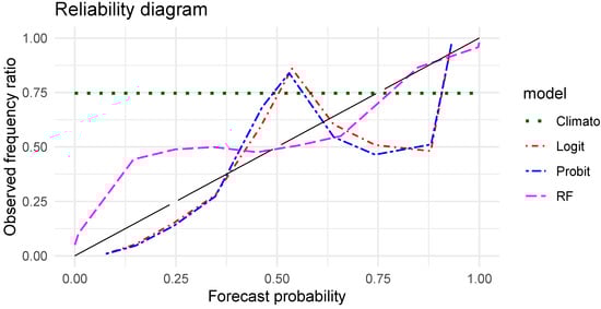 Reliability diagrams of the 3 discrete choice models and of the climatology.