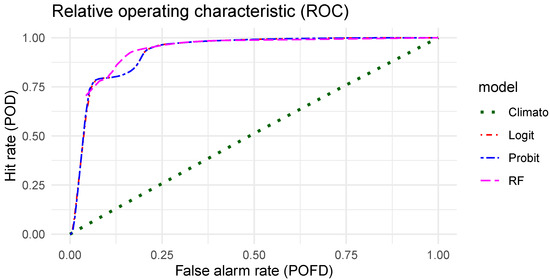 The second interesting attribute to verify is the resolution, which corresponds to the ability of a forecasting system to issue case dependent forecasts. Figure 10 gives the ROC curves of the four probabilistic models evaluated in this work. A perfect resolution will lead to a curve that sticks to the y axis, i.e., a false alarm rate equal to zero, and then follows the line with a hit rate equal to 1. Thus, the higher the area under the ROC curve, the better the resolution. The climatology, which always gives the same forecast, has no resolution and follows the diagonal. The probit and the logit models have exactly the same resolution. The quality of their forecast depends only on their reliability. Finally, the RF model shows a better resolution than the other methods. As the RF model also has better reliability, its overall quality evaluated with a proper score should be the best.