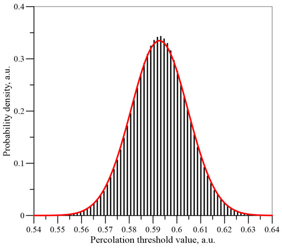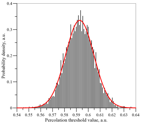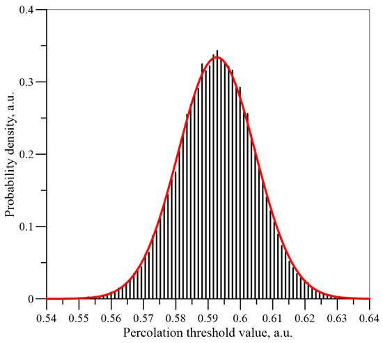 Figure 14 show that increasing the number of iterations to very large values for a matrix of specific dimensions leaves the normal probability distribution of percolation threshold values virtually unchanged. This distribution is described by two parameters—the mean value of the percolation threshold and the standard deviation.