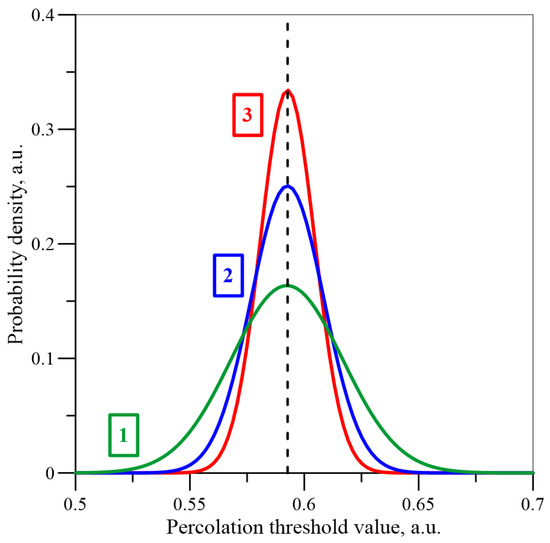 Figure 14. The reduction in the standard deviation value established in the study with an increase in the matrix dimensions allowed us to propose a method to reduce the uncertainty in the percolation threshold estimation not only by increasing the number of iterations but also by increasing the dimensions of the matrix. For example, to reduce the uncertainty in the estimation of the percolation threshold by an order of magnitude for a matrix with