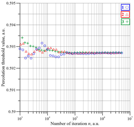 Figure 13 shows the dependence of the average percolation threshold value on the number of iterations for matrixes of dimensions 55, 101 and 151. The figure shows every fifth number of iterations value. It can be seen from the figure that for a relatively small iteration number, the percolation threshold values change over a small range, not exceeding 0.0007. For iteration numbers of 5 × 10