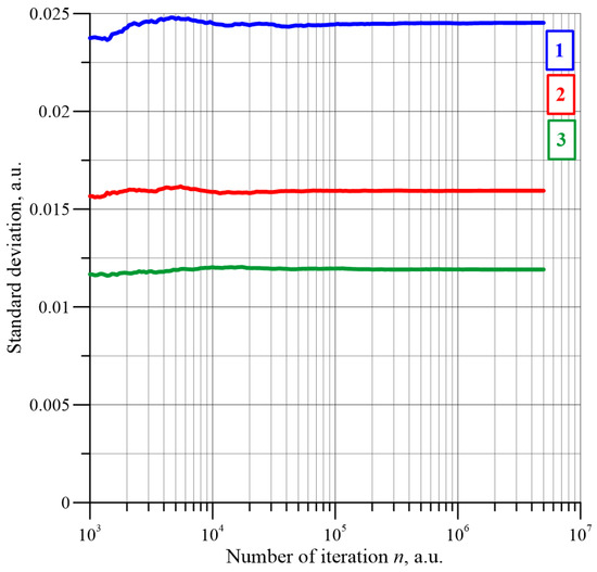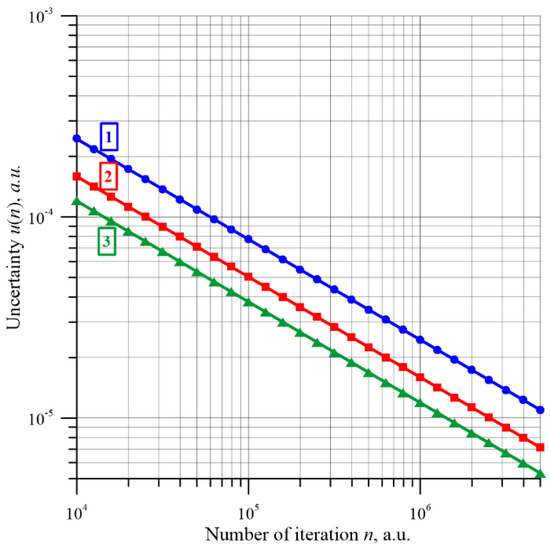 n are the standard deviation values, determined from the simulation results approximations of the type A uncertainty dependence on the number of iterations. These values were also calculated directly from 5 × 10
