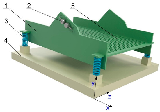 Physical representation of the linear vibrating screen model utilized in the analysis: 1—riddle plate; 2—inertial vibrators; 3—spring support; 4—supporting structure; 5—screen surface.