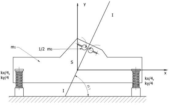 Figure 2 presents the structural diagram of a two-mass inertial vibrator-supported screen. It consists of a screen with a mass of m1, supported by four springs with a spring constant of k/4, along with two unbalanced masses m0/2, acting as vibrators. The vibrator system is rigidly connected to the screen. It operates in a counter-directional motion, causing only inertial forces in the direction of I-I axis to act on the screen. The plane of the I-I axis passes through the centre of mass of the vibrating mass and the axis between the two vibrators. This direction is inclined to the horizontal by an angle α1. The analysis of such a system requires certain simplifying assumptions, where the direction of the acting driving force passes through the centre of mass of the screen, which is satisfied in the case of self-synchronization of the drive, and damping is neglected. Such a system performs linear motion, as no torsional moments causing rotary vibrations of the screen will occur. The value of the driving force acting in the I-I direction is determined by the formula: