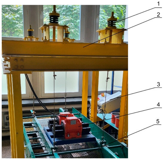 The research was conducted at Department of Machinery Engineering and Transport. The object of the study was a WP screen with a linear trajectory of vibrations, with the screen suspended on a system of four steel cables attached to the screen on one side and to the elastic support system on the other. Vibrations with a linear trajectory were generated by a system of two vibratory motors, 3PH—6 poles type MVE 500/1E-50A0, with a power of 0.55 kW and a nominal speed of 1000 RPM (50 Hz). These motors are mounted on a frame attached to the screen above the screen deck. The engines have opposite rotational directions, and their close proximity allows for the occurrence of the “self-synchronization” effect of the vibrators. A view of this research station with the most important components marked is presented in Figure 4.