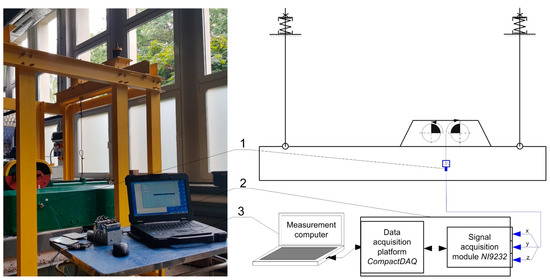 View of the research stand and schematic of the vibration measurement system using an acceleration sensor: 1—three-axis acceleration sensor PCB 356A02; 2—measurement card; 3—measurement computer.