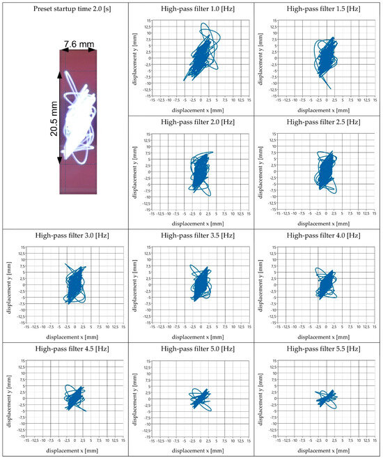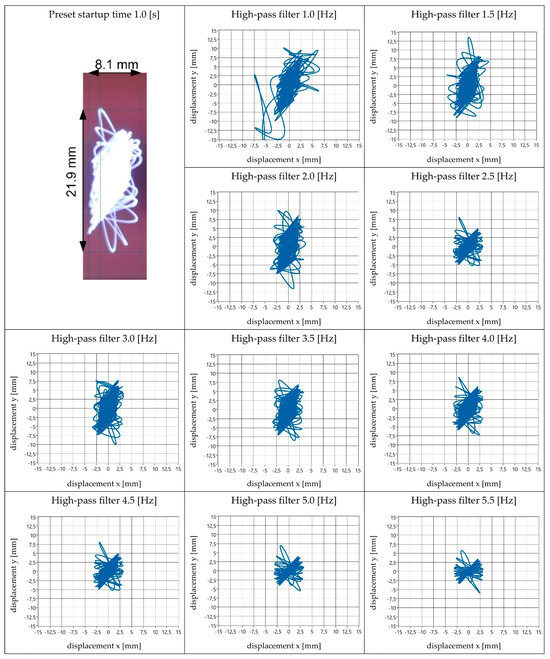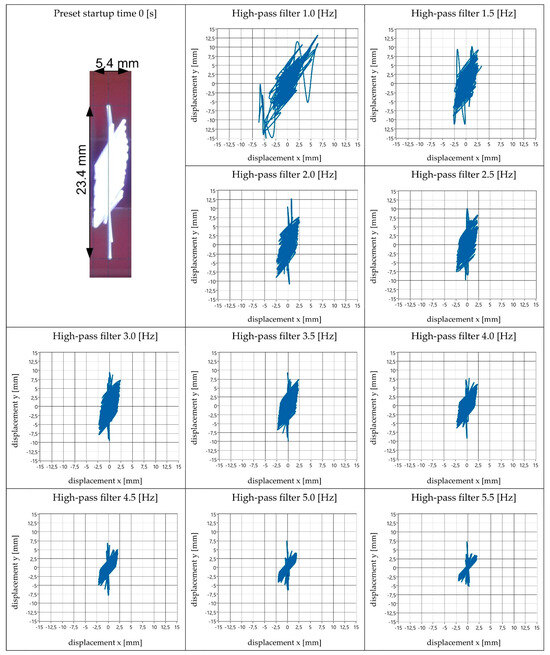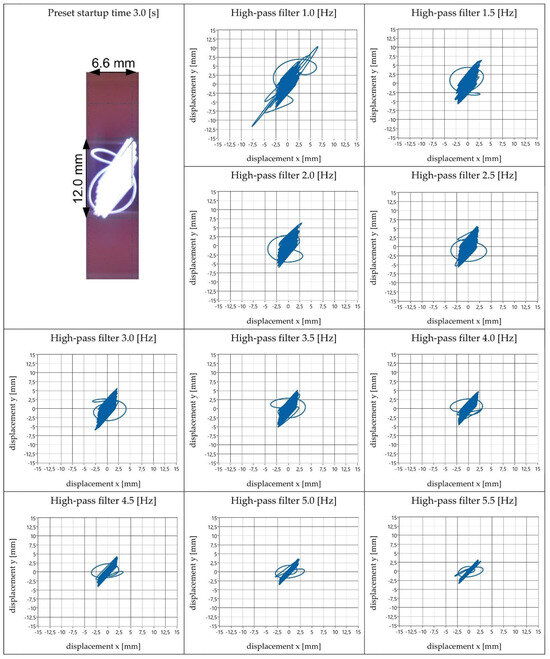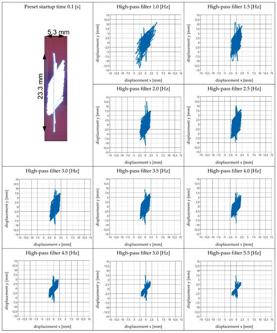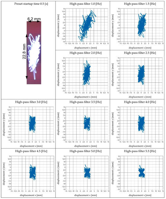 Applying the optical measurement method made generating an actual image of the vibration trajectory possible, allowing for a comparison with the trajectories obtained by the electronic method. The optical measurements’ results, analysis (located in the top left corner), and plots of calculated trajectories for the applied high-pass filter values are presented in Figure 7, Figure 8, Figure 9, Figure 10, Figure 11, Figure 12, Figure 13, Figure 14 and Figure 15.
