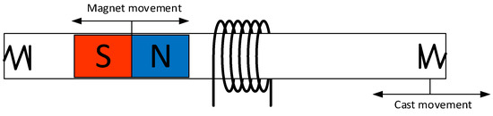 The model of an electromechanical energy harvester system is presented in Figure 1. The vibrations of the system, excited by an external force, cause the movement of the magnet in the cylinder, and the change in the magnetic flux. This in turn induces a voltage in the winding, whose amplitude depends on the number of turns and the rate of change of the magnetic flux [12].