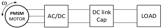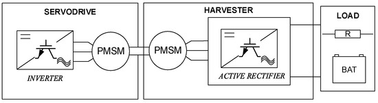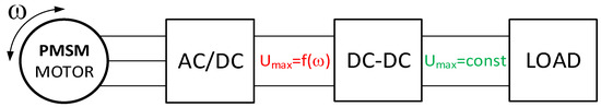 Systems with a single coil and a single magnet operate optimally within a narrow range of frequencies and amplitudes of excitation, resulting in the harvested energy being highly dependent on the parameters of the mechanical vibration source. To improve the efficiency of harvesters based on the movement of the magnet inside the coil, the coil is divided into sections or multiple coils are used [13]. In the literature, one can also find systems composed of multiple coils and multiple magnets [14]. The movement of the magnet in the cylinder presents certain challenges, as the distances between the magnet and the cylinder walls must have some clearance, which can lead to changes in the position of the magnet relative to the cylinder, as well as changes in the forces resulting from their mutual interaction [15]. To address this issue, a generator/motor system can be employed, where the distances between the magnets and the coil are maintained at a constant level by placing one of these elements on a bearing-supported rotating axis. This also prevents any contact between the moving elements of the system. In the work [16], a system based on well-known BLDC/PMSM motors is described, in which permanent magnets move relative to the coils wound on the core, inducing voltage. In this system, as well as in other types of harvesters, such as piezoelectric and thermoelectric ones, power electronic structures are used to shape and increase the voltage amplitude to enable the operation of the receiver powered in this manner [17,18,19]. Typically, such a system includes a cascaded connection of an AC/DC converter, which rectifies the voltage supplied to the next component, namely a DC/DC converter, whose task is to boost this voltage to the load. The block diagram of the typical harvester system with a three-phase motor is shown in Figure 2.