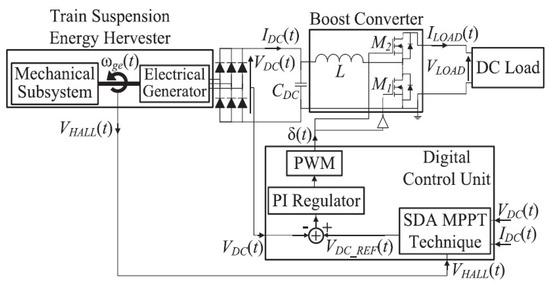 - Costanzo, L.; Lin, T.; Lin, W.; Schiavo, A.L.; Vitelli, M.; Zuo, L. Power Electronic Interface With an Adaptive MPPT Technique for Train Suspension Energy Harvesters. IEEE Trans. Ind. Electron. 2021, 68, 8219–8230. [Google Scholar] [CrossRef]