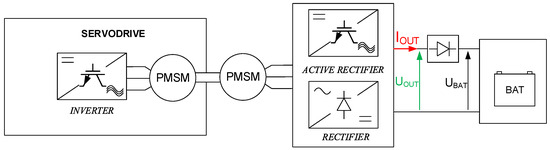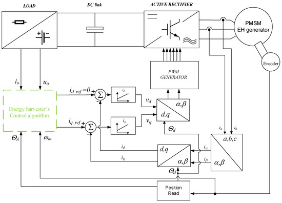 One of the main challenges in such systems is adapting the device parameters to the amplitude and frequency of the excitation. Additionally, the generated voltage amplitude depends on various factors and requires the use of an electronic converter system to enable control of the voltage amplitude and allow energy flow to the powered system. In this article, a proposed energy harvester system consists of a PMSM (Permanent Magnet Synchronous Motor) with a shaft position observation system operating as a generator. The PMSM is connected with an AC/DC active rectifier also with a dc link capacitor, and it is controlled by the proposed algorithm based on field-oriented control. Compared to the solutions mentioned above in the literature, the function of AC/DC and DC/DC converters is achieved using a single device through the utilization of a properly controlled active rectifier, instead of combining two series-connected power converters. A block diagram of proposed energy harvester system is shown in Figure 4.
