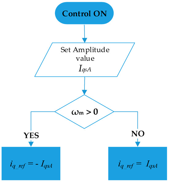 The operation of the main part of the energy harvester control algorithm is as follows. Initially, two parameters need to be set. The first parameter is the desired value of the commanded signal amplitude, denoted as IqsA. The second parameter is the selection of the control strategy, i.e., the appropriate algorithm responsible for shaping the characteristics of the commanded signal based on the position, rotational speed, and direction of the harvester generator rotor, which are continuously read and calculated by the measurement sub-block. The commanding of the iq_ref component as a function of the position changes of the PMSM generator shaft from the upper block depends on the control method as follows. It is known that the frequency of vibrations, fe, depends on the rotational speed and direction of motion. Therefore, the reference value iq_ref for a vibration period, Te, has a constant value with the opposite sign to the rotational direction, which can be described mathematically as