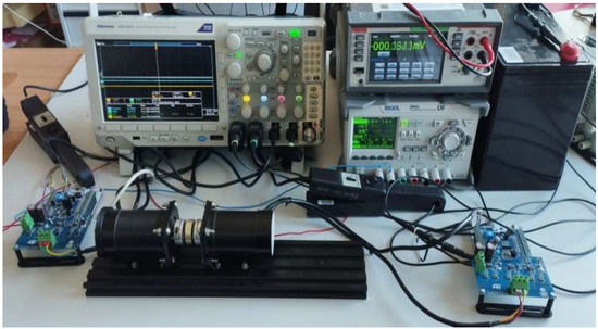 For an excitation frequency of 1 Hz, the system achieves a maximum rotational velocity ranging from −150 to 150 rpm. For simplicity, the amplitude of motion A was defined in relation to full rotor revolutions. In the software, the amplitude A was set to 15.32 radians. This value can be verified by the angular displacement waveform (Figure 9), where it can be seen that it is offset by ¼ of the oscillation period relative to the rotational velocity curve. From the A(t) graph, it can be observed that the displacement value corresponds to approximately 2.44 revolutions in one direction, which is slightly less than 5 machine revolutions for the entire oscillation period. The excitation system is coupled with the harvester system shaft, consisting of a PMSM machine and an active vector rectifier. The shaft position observation system Θ is implemented using a 14-bit magnetic encoder, while the measured values of the harvester’s voltages and currents are obtained using 12-bit converters of the STM32G431 microcontroller. The active rectifier is a three-phase inverter topology based on six MOSFET transistor STL220N6F7 with low RDS(on) = 0.0014 Ω. The same configuration and topology are used in a servo three-phase inverter. An algorithm for controlling the rectifier operation was also developed, enabling the adjustment of the harvester’s output voltage amplitude. Based on the measured phase currents and determined rotor position, the id and id current components of the generator were calculated according to the diagram in Figure 5, and then modified to achieve an increased output voltage amplitude.