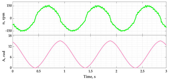 The parameters of the excitation system were selected according to the data obtained by researchers from the article [15]. The oscillation frequency of the drive was set to 1 Hz, and the change in the position of the system shaft has a sinusoidal characteristic—as shown in Figure 9.