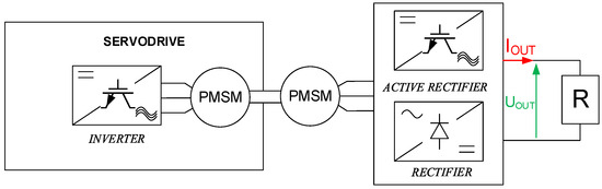 Initially, measurements were conducted for a constant amplitude and excitation frequency for both the system with a diode rectifier and the proposed control method to compare these two solutions. The system was loaded with a resistive load of R = 20 Ω, according to the diagram shown in Figure 10.