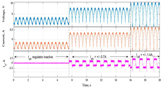 The measurement results are presented in Figure 11. In the first interval (up to approximately 7.8 s), the control system for current components was inactive, and the energy conversion process was solely carried out via the diode rectifier. In this case, the voltage amplitude generated was approximately 3.4 V, with an excitation system operating at a frequency of about 1 Hz. In the subsequent intervals (7.8 s to 15.9 s and after 15.9 s), the proposed control method was activated. In the second interval, the desired amplitude value of the q-axis current component varied depending on the rotational direction within the range of IqA = ±0.7 A, resulting in an achieved voltage amplitude of approximately 7.5 V. In the last time interval, the amplitude of the iq component varied in the range of IqA = ±1.4 A, resulting in an output voltage amplitude of approximately 11 V for the harvester. The waveforms clearly show the significant influence of the applied control method on the observed quantities. The aforementioned increase in the output voltage amplitude improves the usability of the system when working with energy storage and buffering systems. The ability to smoothly adjust the output voltage, and therefore, the transferred power from the excitation source to the powered system, enables the implementation of complex optimization algorithms for the operation of such systems. Table 1 summarizes the average voltage and current values for each rectifier version calculated using the formulas