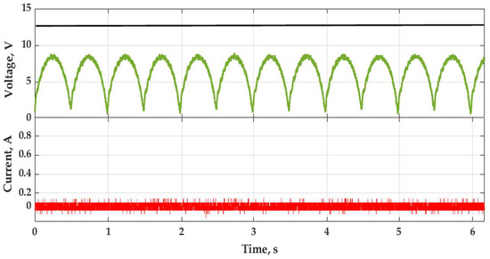 Initially, voltage and current measurements at the output of the harvester in conjunction with a diode rectifier. The semiconductor diode used prevents the flow of energy from the chemical battery to the drive controller of the system. As expected, the amplitude of the output voltage was too low to allow energy to flow into the chemical battery as shown in Figure 13.