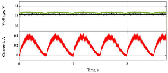 The nature of harvester systems often involves connecting them to a small energy storage device, commonly built using a chemical battery. This combination is highly efficient and allows the system to operate when vibrations are not available. However, chemical batteries impose strict requirements on the voltage amplitude generated by the harvester. To assess the impact of the control method on the operation of the harvester system with a chemical battery, the waveforms of the output current and voltage were recorded, while the harvester was operating in the configuration shown in Figure 12. The nominal voltage of the chemical battery is a crucial parameter in its selection. In the constructed storage system, a battery with a capacity of 40 Ah and a rated voltage of 12 V was used. The large capacity of the battery ensured that the voltage at its terminals did not vary significantly during the experiments, which facilitated comparative studies of different energy harvesting systems.