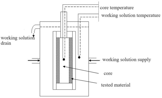 Thermal conductivity testing in the temperature range from −50 to +80 °C was carried out using a bicalorimeter. The diagram of the measuring device is shown in Figure 1.