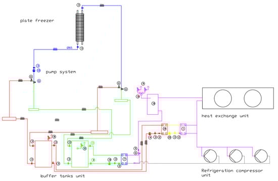 Therefore, many authors have recently dealt with the topic of food preservation using plate freezers. One of the proposals is presented by Fernandez et al. [3]. The authors describe their innovative model for a horizontal plate freezer, which is based on a cascade refrigeration system, where ammonia—acting as an upper-order factor—is responsible for the condensation of CO2. Referring to the same energy distribution system, Dopazo et al. [4] describe their research on the freezing process in a horizontal plate freezer, focusing on determining the relationship between the temperature of the coolant inside the freezing plate and the freezing time of the product. A relationship is observed, indicating that lowering the temperature of the coolant inside the plate by 1K results in a reduction in the freezing time by 2 min. Cao et al. [5] postulate the possibility of using ejectors for each plate inside the freezer. However, such solutions can only be used in freezers operating in a direct expansion system. A classic system of a plate freezer with vertical loading powered by an ammonia system (diesel engine–ammonia system) used to freeze a catch of fish on a ship is described by Backi and Gravdahl [6]. The article defines a one-dimensional mathematical model and draws attention to the existence of a hidden heat of fusion. The topic of freezing food products immediately after fishing/shrimping is also discussed by Haddad et al., Lakshimisha et al., and Zhou et al. [7,8,9]. In these articles, products such as shrimps and mackerel frozen in a plate freezer immediately after being caught are subjected to sensory as well as qualitative analysis, and the results are promising.