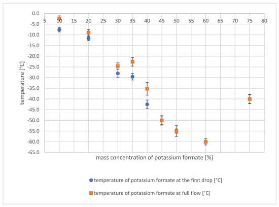 From the conducted tests, it was observed that the pour point decreases as the proportion of potassium formate in the solution increases. The lowest pour point of −60 °C was achieved at a concentration of 60%. However, as the concentration of potassium formate in the solution increases further, the pour point also increases. At a concentration of 75%, the pour point recorded was −40 °C. To achieve the lowest crystallization temperature in the intermediate circuit of a refrigeration plant, a concentration range of 45–60% is considered optimal. However, considering the system’s resistance, the ideal concentration range is between 45 and 50%, since potassium formate has a higher resistance than water. Hence, increasing its proportion in the solution beyond this range does not provide any significant benefit to the refrigeration system’s operation.