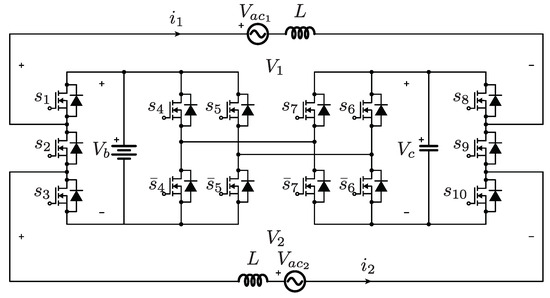 As presented in Figure 1, the converter comprises 14 semiconductors and two energy storage units, namely a battery and a capacitor. As discussed earlier, this structure allows the generation of two decoupled AC outputs ( and ). The system can be connected to two AC systems, where each one is modeled by a non-ideal inductive filter and a single-phase AC supply (, where ).