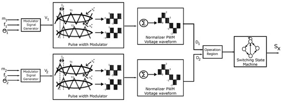 The first stage of the proposed modulation scheme presented in Figure 2 allows the modulating signal for the AC output voltages and to be generated, created by the converter. This signal is defined by: