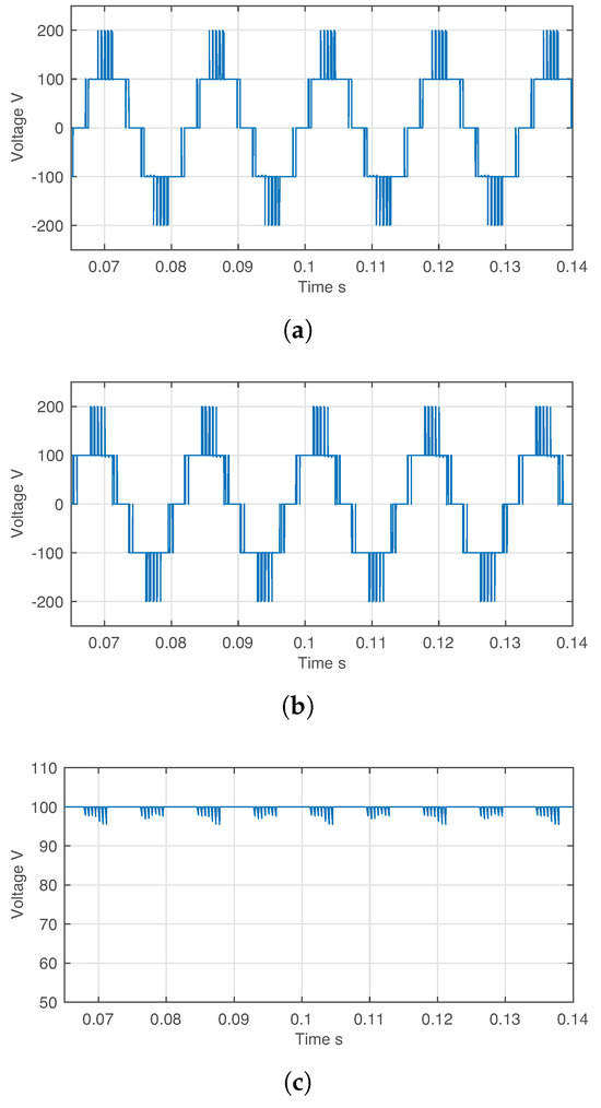 In Figure 4a,b, both AC output voltages of the system exhibit 5-voltage levels, and it is possible to appreciate the phase difference between both voltage signals. It is important to note that this decoupled operation between both AC voltage output is possible because the references are still inside the stable operation region. Finally, in Figure 4c, the capacitor voltage balance is shown, and similar to the earlier case of Section 4.1, it presents an average value that matches battery voltage, confirming the system remains internally balanced.