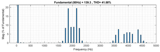 The harmonic content of the voltage generated at the converter outputs is shown in Figure 5. It is possible to appreciate how the fundamental component appears and, moreover, the set of harmonics that appear around four times the carrier frequency (). This is due to the unipolar PWM modulation implemented and multiplied by the number of modules used, i.e., . Specifically, in this work, each converter has two cells, i.e., , so the voltage harmonics produced by the modulation concentrate most of their energy on the side bands around .