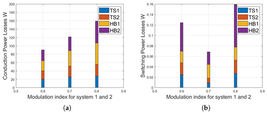 To verify the losses of the converter, the semiconductors of the topology presented in Figure 1 are divided into four groups. Semiconductors , , and and , , and correspond to the three switch cells (TS) that are connected at the ends of the system, which are labeled as TS1 and TS2, respectively. Then, semiconductors , and , (and their respective complementary devices) correspond to the internal H-bridge (HB) configuration of the system, which are grouped as HB1 and HB2, respectively. Moreover, the modulation index for output 1 is fixed to , while the modulation index of output 2 is modified to evaluate losses under different power ranges.